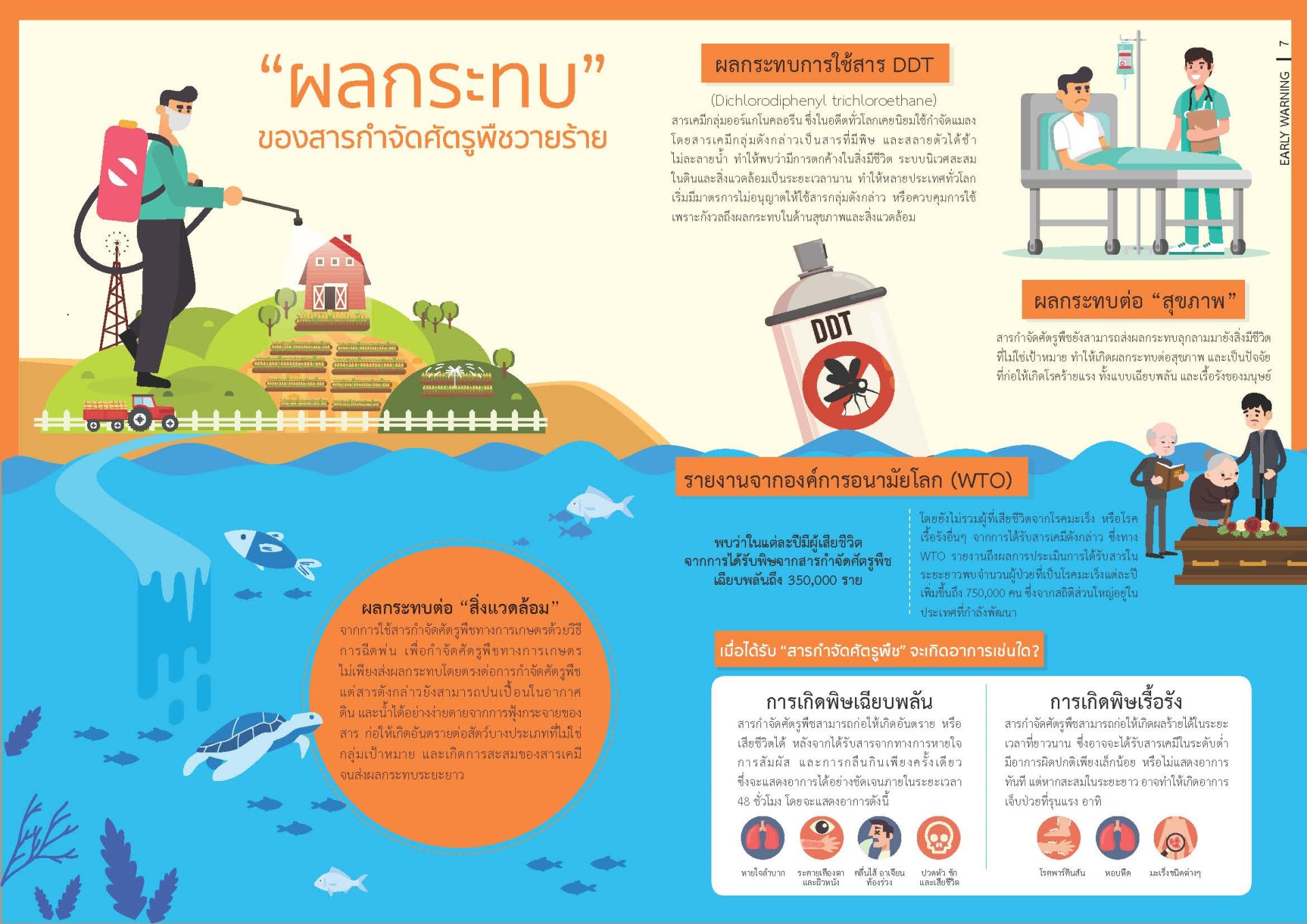 3. ผลกระทบต่อ "สุขภาพ" สารกำจัดศัตรูพืชยังสามารถส่งผลกระทบลุกลามมายังสิ่งมีชีวิตที่ไม่ใช่เป้าหมาย ทำให้เกิดผลกระทบต่อสุขภาพ และเป็นปัจจัยที่ก่อให้เกิดโรคร้ายแรง ทั้งเเบบเฉียบพลัน และเรื้อรังของมนุษย์